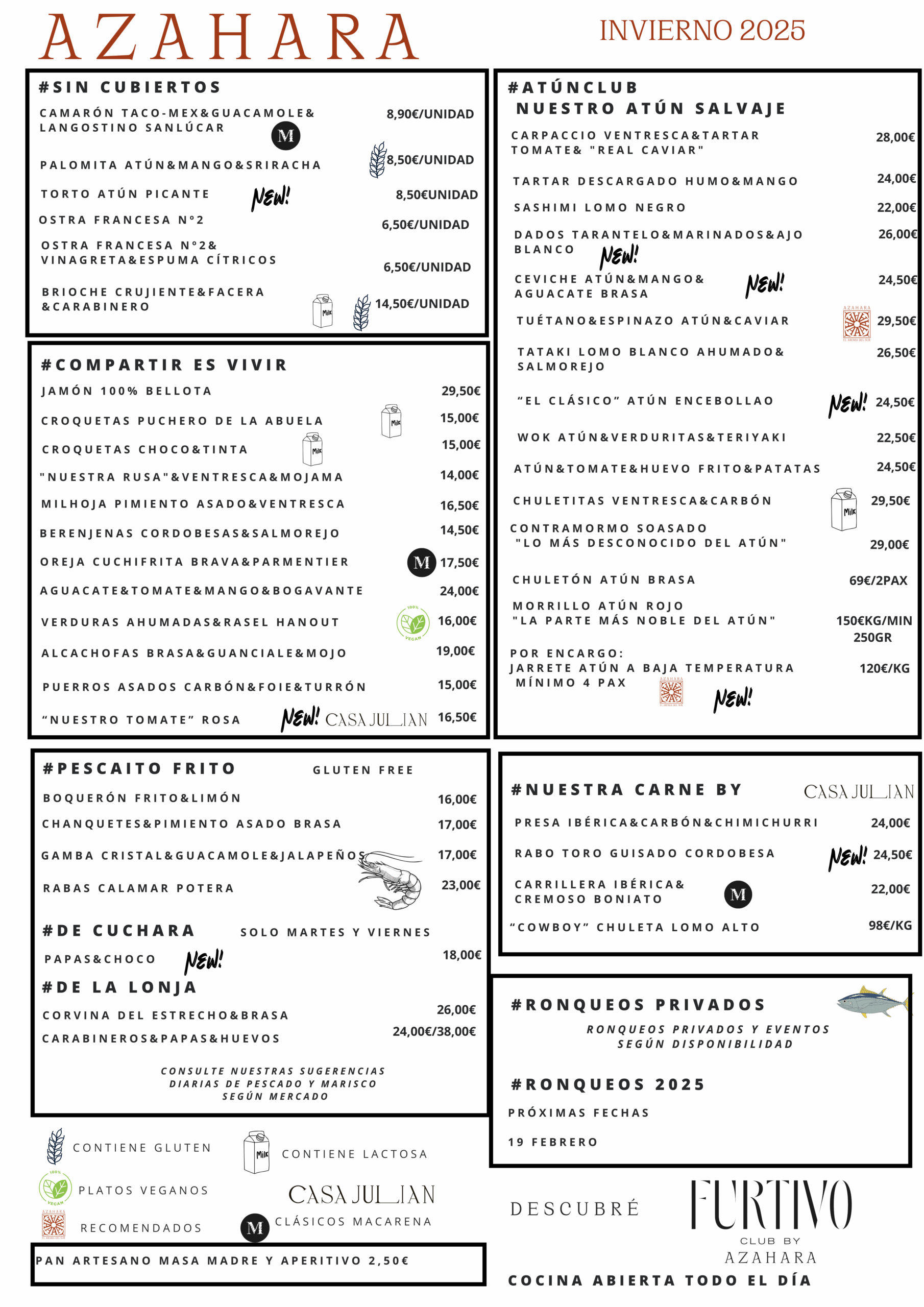 Azahara, es el nuevo referente de la alta cocina andaluza en Madrid, especializado en el mejor producto de lonja y las brasas; se encuentra en una de las zonas más exclusivas de la capital. Azahara es un lugar donde el arte se respira en el ambiente, la cocina es un homenaje a las raíces del sur, y el entorno se funde con la elegancia de un patio andaluz contemporáneo.